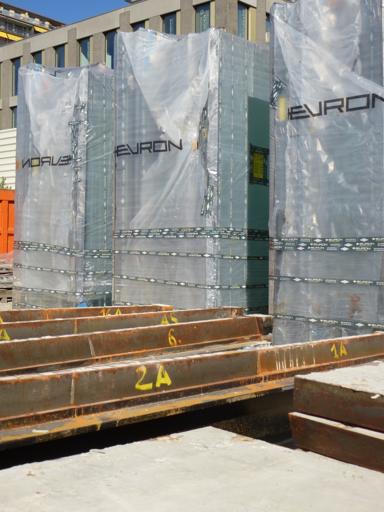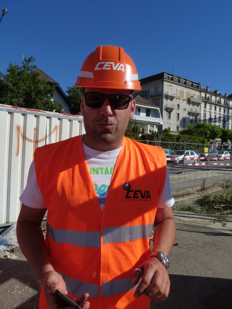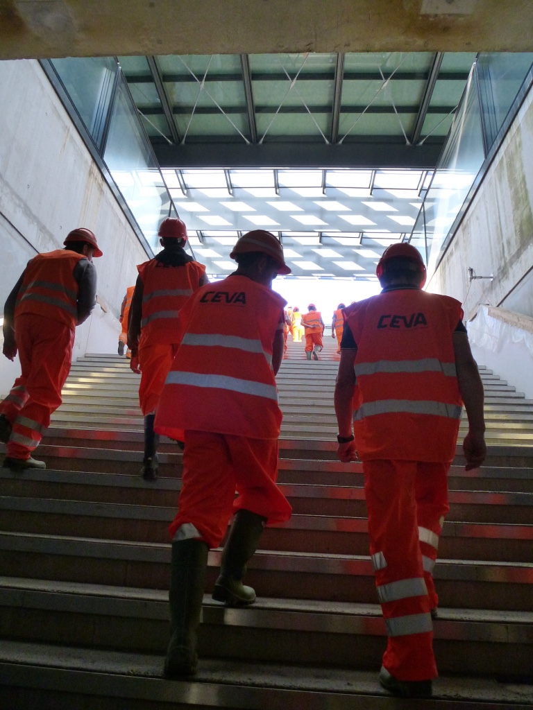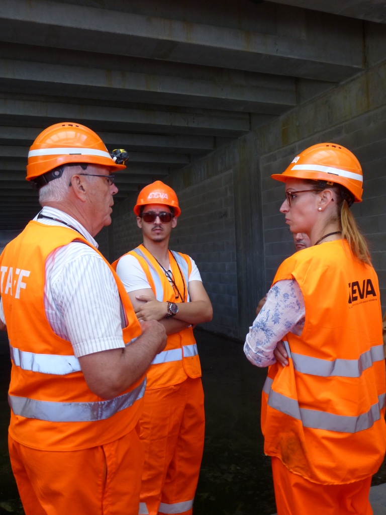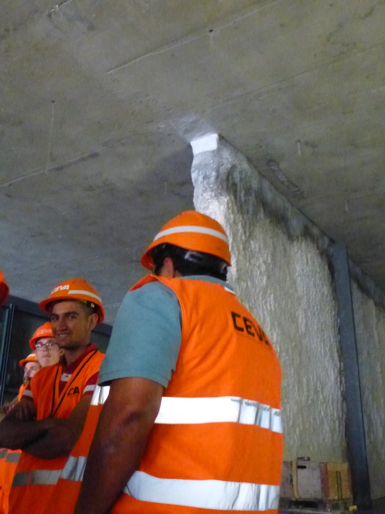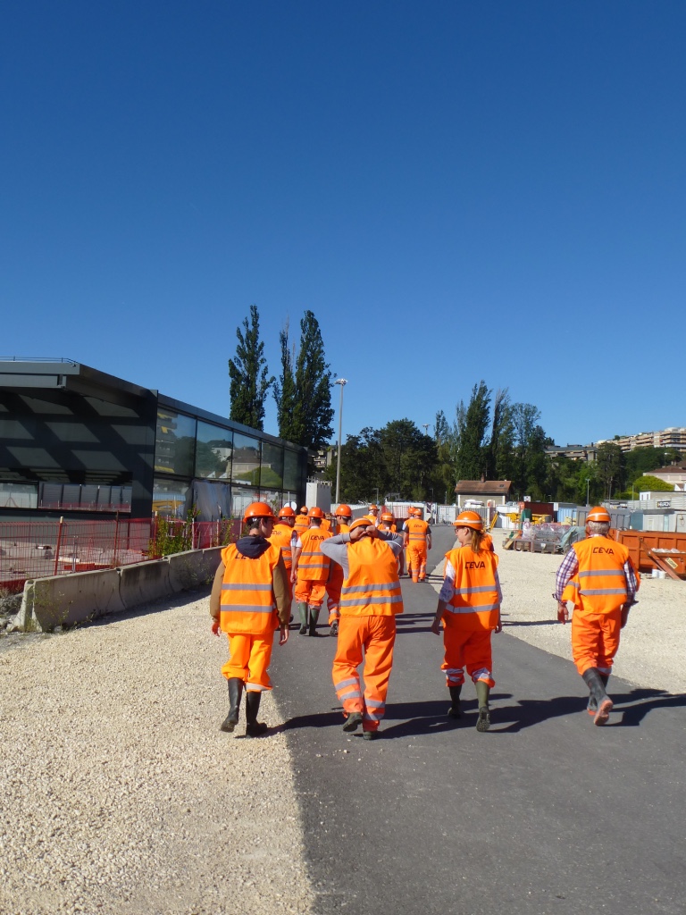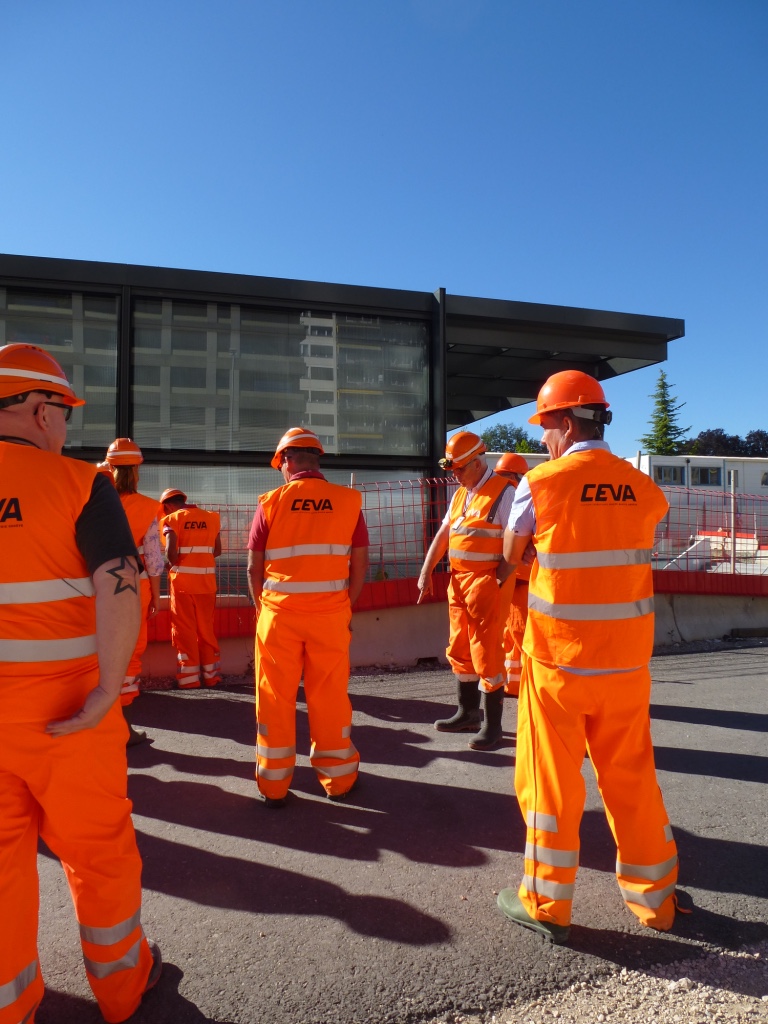 Avant de se rendre sur le chantier, les participants sont donc réunis dans le pavillon coloré du Léman Express/CEVA, où ils peuvent découvrir une petite exposition en attendant les quelques retardataires. Serge Anet, coordinateur des visites et guide du CEVA, présente ensuite le projet avec des explications détaillées, des chiffres, des données techniques et informations sur les différentes procédures et oppositions. Puis tout le monde revêt la tenue de chantier et se dirige vers les travaux de la gare des Eaux-Vives. La « vraie » visite commence pour les invités, tous des professionnels de la construction. La théorie fait place aux questions et entretiens individuels avec les trois accompagnants du CEVA. Les panneaux vitrés recouvrant la gare sont examinés de près : Leur structure confère un caractère spécifique à la gare et diffuse la lumière. Cette caractéristique se retrouve sur tous les chantiers du CEVA.
